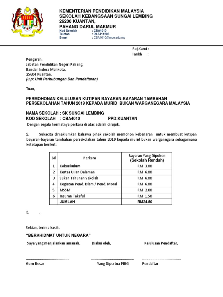 Contoh Surat Kutipan Bagi Bayaran Tambahan Persekolahan Murid Bukan Warganegara